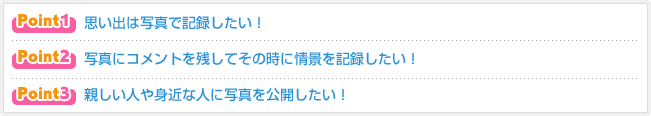 その日その場を鮮明に記録するのに、写真に敵うものもありませんよね。写真を見るとその時の思い出も思い浮かぶものです。 My@T COM(マイアットティーコム)のアルバム機能なら写真をパソコンや携帯からでもアップロードできます。更に、写真毎にコメントをつけることも出来るのでとっても便利!さらにアルバムを指定の人にだけ公開できるので、趣味の作品集を発信するなど、使いかたは色々!