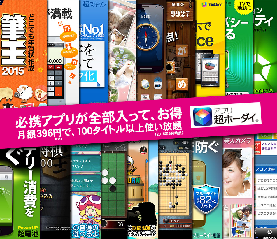 アプリ超ホーダイは、ソースネクスト株式会社へのお申し込みが必要となります。詳しくは、アプリ超ホーダイのご利用規約をご確認ください。